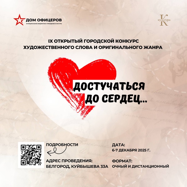 Даты проведения: 6 - 7 декабря 2025 г. Прием заявок осуществляется по ссылке vk.cc/cRb5ao до 3 ДЕКАБРЯ ВКЛЮЧИТЕЛЬНО. Вся подробная информация указана в Положении конкурса При необходимости внести изменения в заявку, просим не подавать новую заявку, а связаться с оргкомитетом конкурса! Задать интересующие вопросы можно в сообщениях группы или по телефону +7(4722) 34-82-19